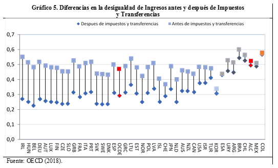 Infortunadamente, esta no es la situación con el Estatuto Tributario prevaleciente en Colombia en la medida en que el índice de concentración del ingreso antes y después de impuestos se mantiene casi inalterado (Garay y Espitia, 2019, capítulo 3), a diferencia de lo que acontece en otros países incluso de la región, de acuerdo con lo señalado por la Ocde (Gráfico 5).